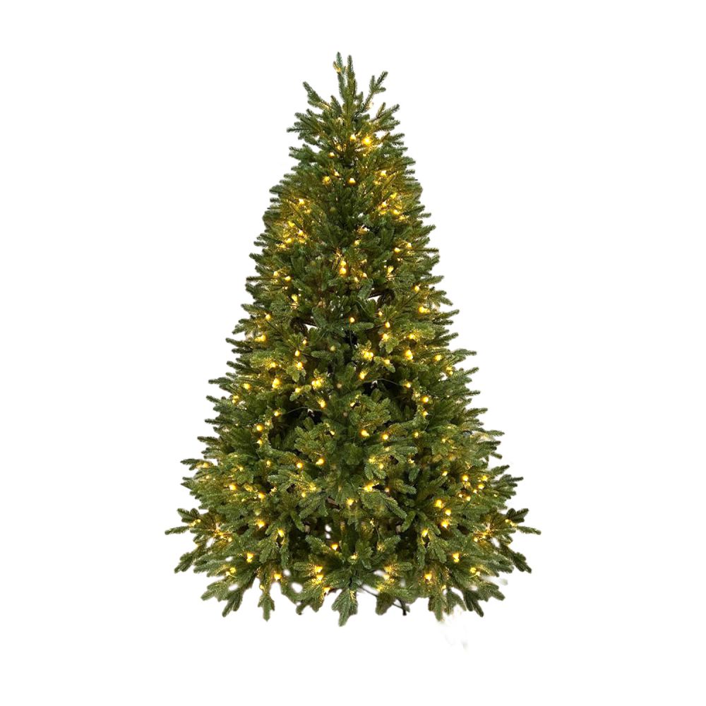 ბუნებრივის მსგავსი მწვანე ნაძვის ხე, ინტეგრირებული LED ნათურებით, დამზადებული 100% სილიკონის წიწვებით. გამძლე დრეკადი მეტალის ტოტებით და ჯანმრთელობისთვის უსაფრთხო მასალისგან დამზადებული წიწვებით. მეტალის მყარი სადგამით და მთავარი ღერძით.