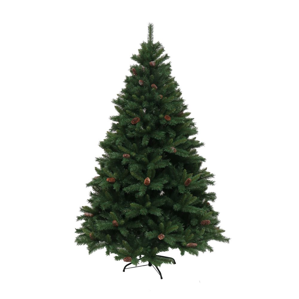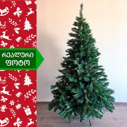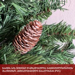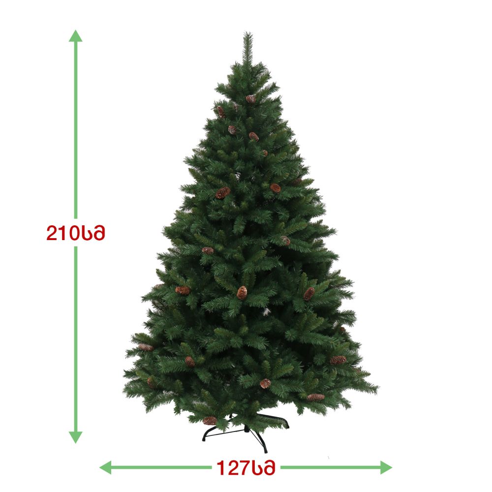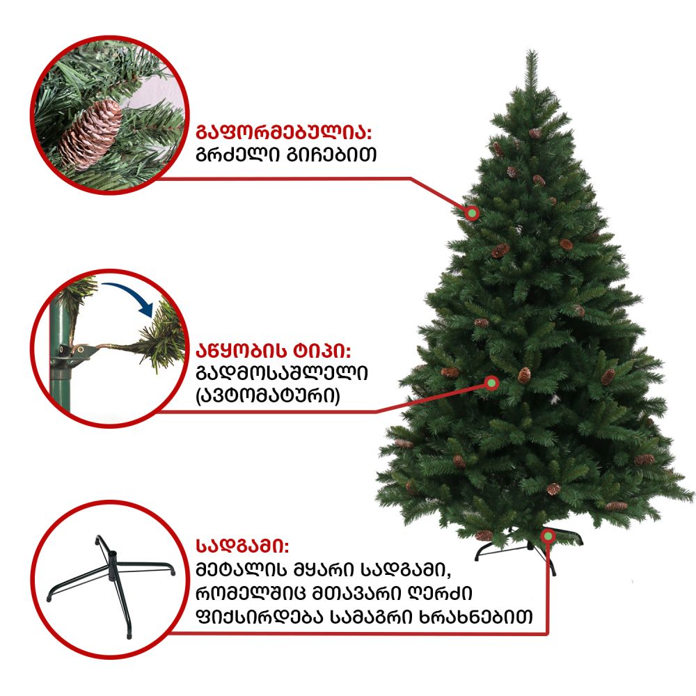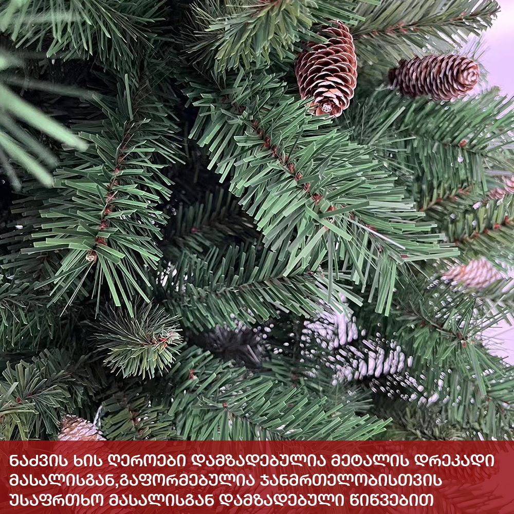 სადა მწვანე ნაძვის ხე, გაფორმებული გირჩებით გამძლე დრეკადი მეტალის ტოტებით და ჯანმრთელობისთვის უსაფრთხო მასალისგან დამზადებული წიწვებით. მეტალის მყარი სადგამით და მთავარი ღერძით.