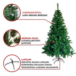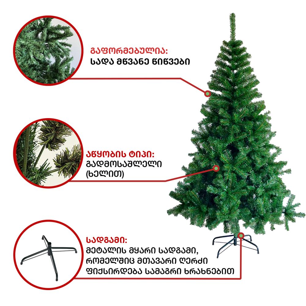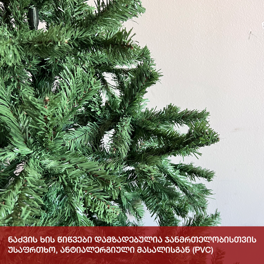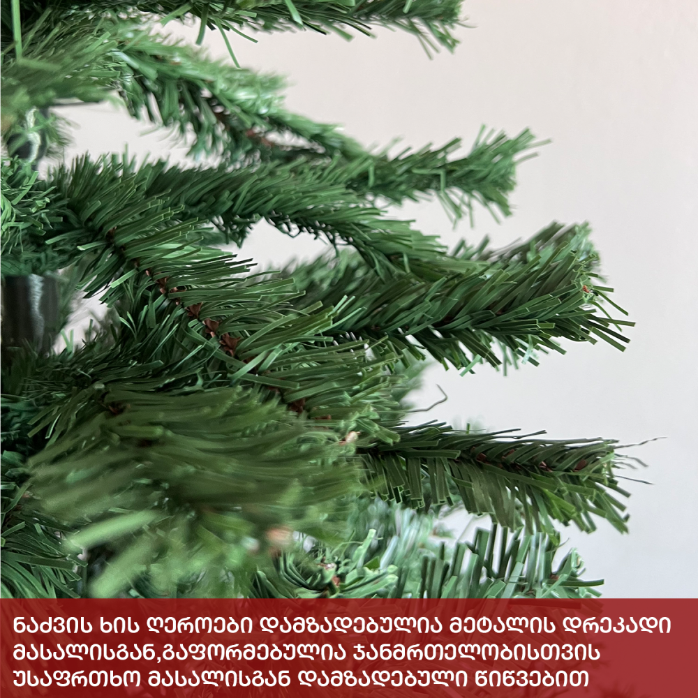 ნაძვის ხე გამძლე დრეკადი მეტალის ტოტებით და ჯანმრთელობისთვის უსაფრთხო მასალისგან დამზადებული წიწვებით. მეტალის მყარი სადგამით და მთავარი ღერძით.